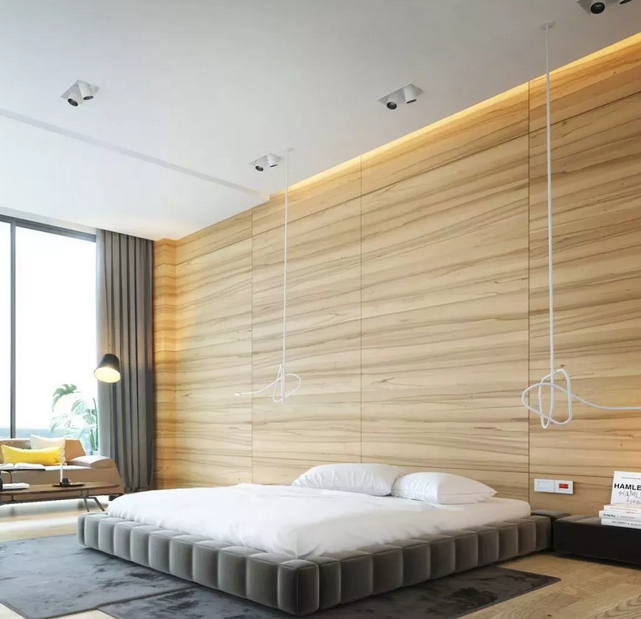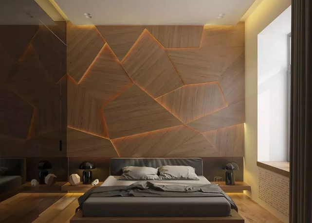 近年來北歐、日式風格逐漸盛行,原木也開始成為設計上的主打材質, 用木飾面代替相框、裝飾畫來進行臥室裝扮,新意十足。
