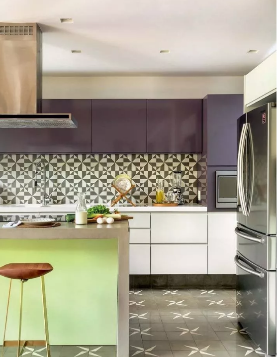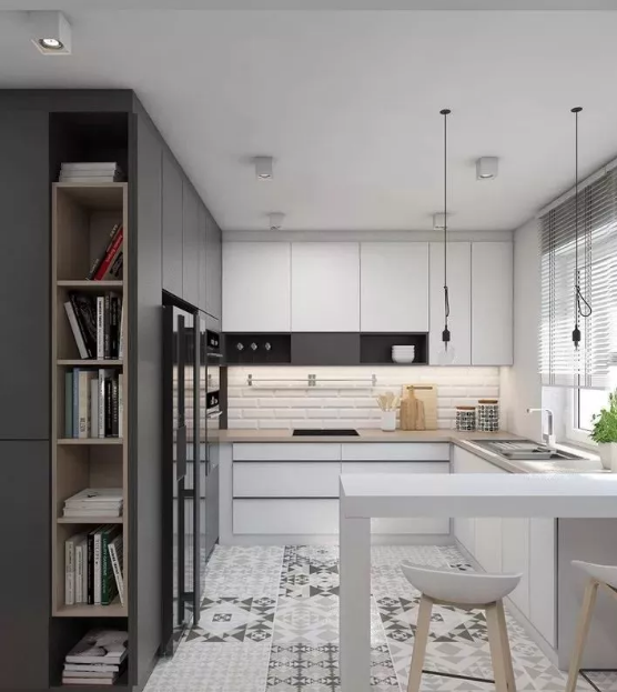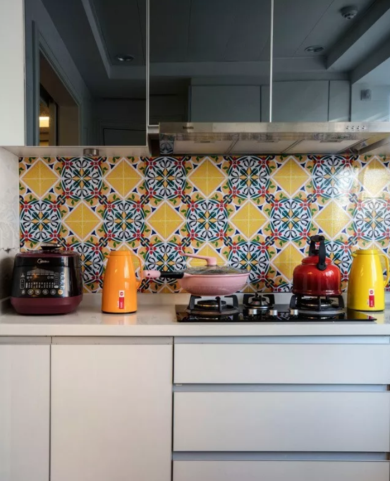 廚房的墻面一般比較單調(diào),實(shí)用性遠(yuǎn)遠(yuǎn)勝過了裝飾性,因而沒有太大的亮點(diǎn)。如果用花磚進(jìn)行裝飾,和其他單色磚形成一個(gè)視覺上的對比,或許就能輕松打造視覺焦點(diǎn)了。
