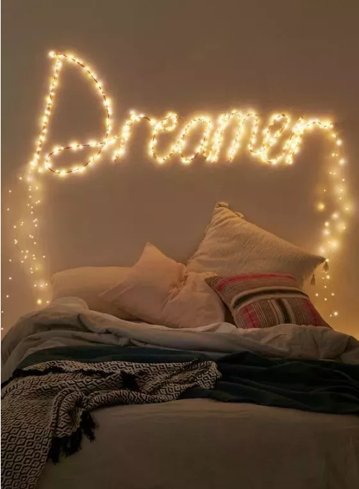 用串燈裝飾房間端端已經(jīng)介紹過很多次啦,用星星燈在床頭固定出一個具體的形狀來做裝飾,或者干脆做個照片墻效果也不錯。