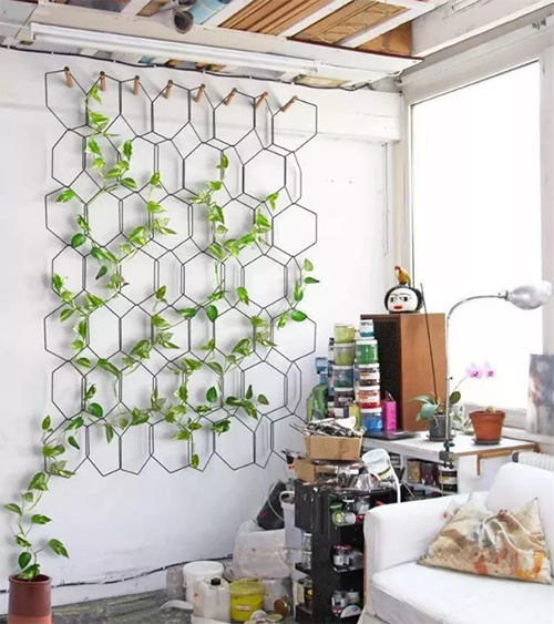 用金屬絲按規(guī)則或不規(guī)則的方式組合成一個整體,讓植物順著幾何架構(gòu)自然的延伸和生長,待它茂盛時你收獲的不僅是滿眼的綠色好風景,更是清新怡人的好空氣。推薦植物:綠蘿。