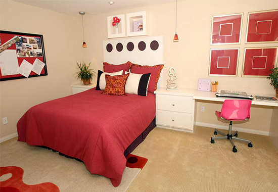 中國人認為紅色是吉祥色,新婚的喜房就都是滿眼紅彤彤的。紅色還具有熱情、奔放的含義,充滿燃燒的力量。但居室內(nèi)紅色過多會讓眼睛負擔過重,產(chǎn)生頭暈?zāi)垦5母杏X,即使是新婚,也不能長時間讓房間處于紅色的主調(diào)下。建議選擇紅色在軟裝飾上使用,比如窗簾、床品、靠包等,而用淡淡的米色或清新的白色搭配,可以使人神清氣爽,更能突出紅色的喜慶氣氛。