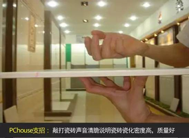 敲打瓷磚,聽聲辨密度。選擇瓷磚最重要的是考慮質(zhì)量問題,辨別瓷磚好壞有很多標準,可以進行敲打,聲音清脆說明瓷磚瓷化密度高,質(zhì)量好。