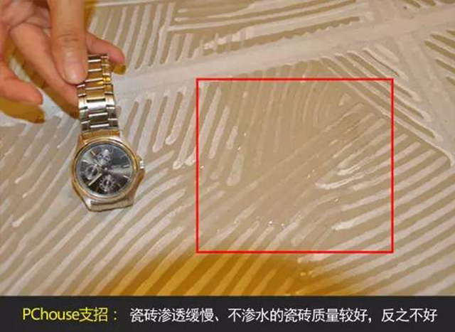 看瓷磚吸水率。一般來說,瓷磚的吸水率低,代表瓷磚的內(nèi)在穩(wěn)定性越高,也就越適合濕氣或水分含量較高的空間,如衛(wèi)生間、廚房等,且不會產(chǎn)生黑斑等問題。檢驗瓷磚吸水率的常用方法是將瓷磚的背面倒水,滲透緩慢甚至不滲水的瓷磚質(zhì)量較好,反之則為不好。