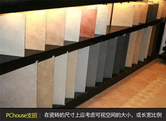 在瓷磚的尺寸上應考慮可視空間的大小,如果客廳被家具遮擋的地方多,也就是地面使用時,人的實際可視的大小,如果可視面積小的話,也應考慮用小一點規(guī)格的。又或者考慮客廳的長寬比例及大小,就效果而言,以瓷磚能全部整片鋪貼為好,就是指到邊盡量不裁磚或少裁磚,盡量的減少浪費,一般而言,瓷磚規(guī)格越大,浪費也越大。