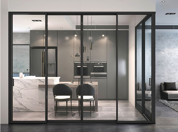 對(duì)隔音有要求,而且密封性要好,以防油煙溢出,還要兼顧美觀,可以選用重量輕的鋁合金推拉門,隔音隔熱,而且易清潔。