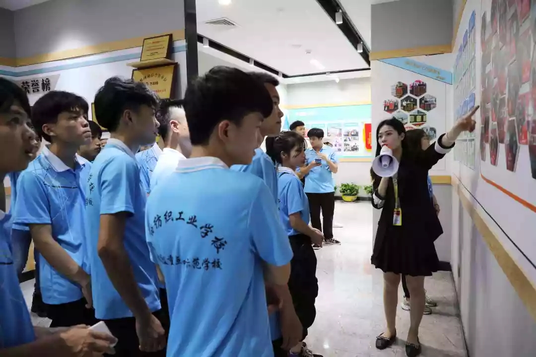 人資部經(jīng)理劉高才、主管黃丹丹帶領(lǐng)紡織工業(yè)學(xué)校學(xué)生參觀文化長(zhǎng)廊,向?qū)W生們介紹公司企業(yè)文化理念、組織架構(gòu)、服務(wù)理念、企業(yè)榮譽(yù)、員工關(guān)懷等方面內(nèi)容,讓學(xué)生們對(duì)公司的企業(yè)文化有更深的了解。