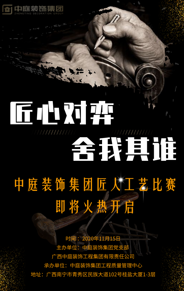 中庭裝飾集團2020匠人工藝比賽將于11月15日在集團總部盛大召開!本次比賽是對質(zhì)管中心的工藝升級、培訓(xùn)等工作開展成果的一次考核,也是為了給工匠師傅們提供一個展示技能的舞臺,大力弘揚工匠精神,通過工藝技能的切磋全面提升一線施工工匠的綜合素質(zhì)!