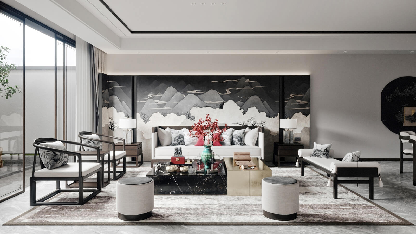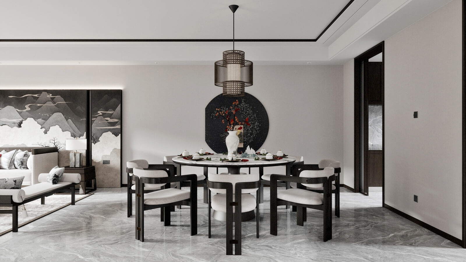 瀏覽量:1137設(shè)計師打破了人們對傳統(tǒng)中式風格的固有觀念,加入了許多現(xiàn)代化的設(shè)計元素。其中,中國風味一點兒也沒少。山水畫,瓷器,深色桌椅,這些富含古典韻味的裝飾,完美地與現(xiàn)代化的空間融為一體,體現(xiàn)出靜謐的美感。