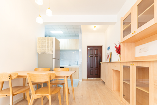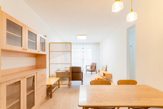 整個空間基于原木風格上做搭配,陽臺打通,解決不互通的采光問題,天氣陰晴,都可以為空間做天然點綴;開放式廚房和餐廳可以共享操作,互不干擾,又可以加強家人之間的互動性提高家庭的幸福感。