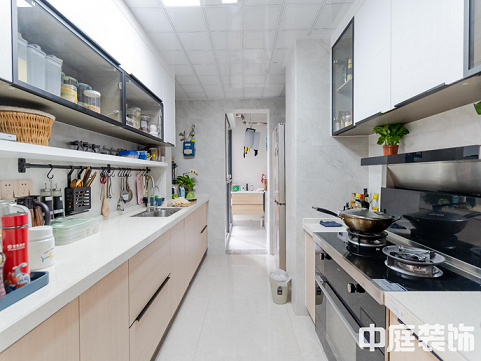 整個廚房在存儲空間上也做足了規(guī)劃,日式收納及空間的運(yùn)用總能提升家的質(zhì)感。 頂柜也是用了木色和白色搭配,增大了儲物空間。一些墻壁上的掛鉤等收納神器,這個時候可以派上用場了。